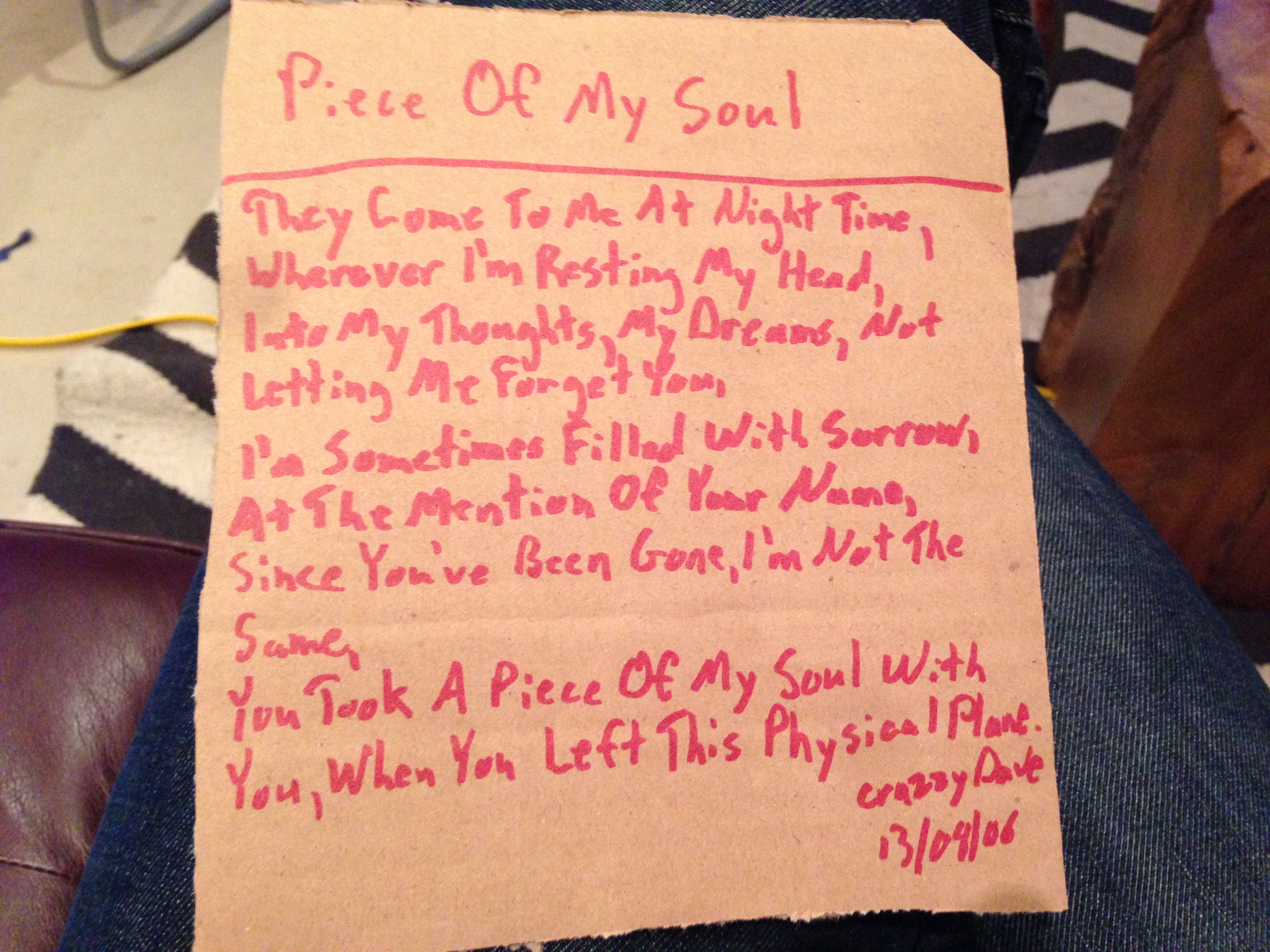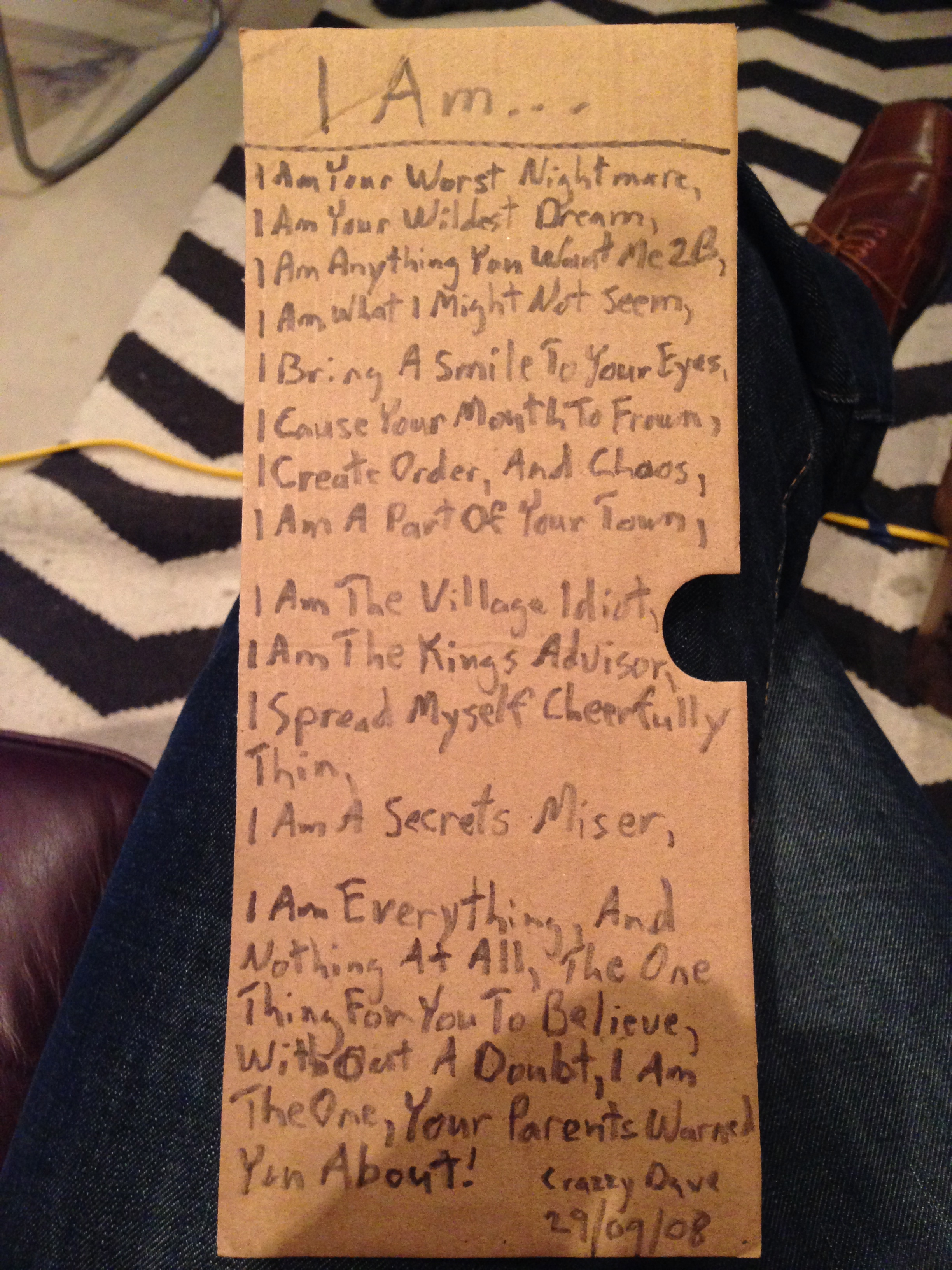 Like many people, I have walked past Dave many times without stopping to say hello or taking a moment to read one of his poems. Today, I decided to stop and spend a bit of time with Dave – partly to see if he really was ‘crazzy’ and partly because I should have stopped the first time I saw him a couple of years ago.